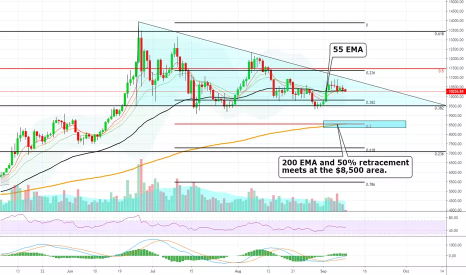 BTC will most likely retest the bottom of the triangle once again if the 55 EMA fails to hold up the price on the daily. Another retest could be the final push to get another leg down and touch the 200 EMA. We are slowly approaching the triangles apex.
