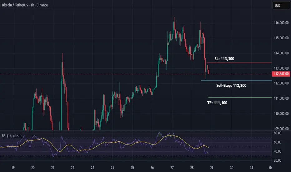 Bitcoin is again showing Bearish momentum... Let's take a 1:1 Sell-Stop trade here on 1H timeframe.