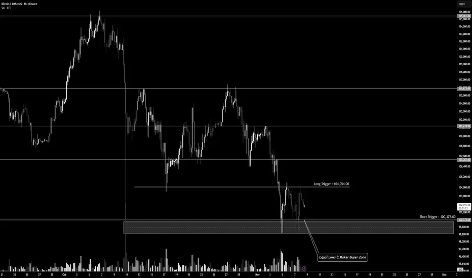 A breakdown below the support zone (two equal lows and a key weekly/daily support) around $100,372, combined with the formation of a lower high below that zone and strong selling pressure, could offer a short opportunity.