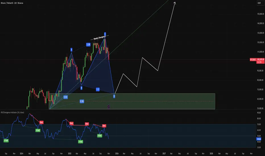 Bitcoin is currently forming a Cypher Harmonic Pattern on the weekly timeframe — a rare but reliable reversal setup that often appears near exhaustion phases of a macro move.