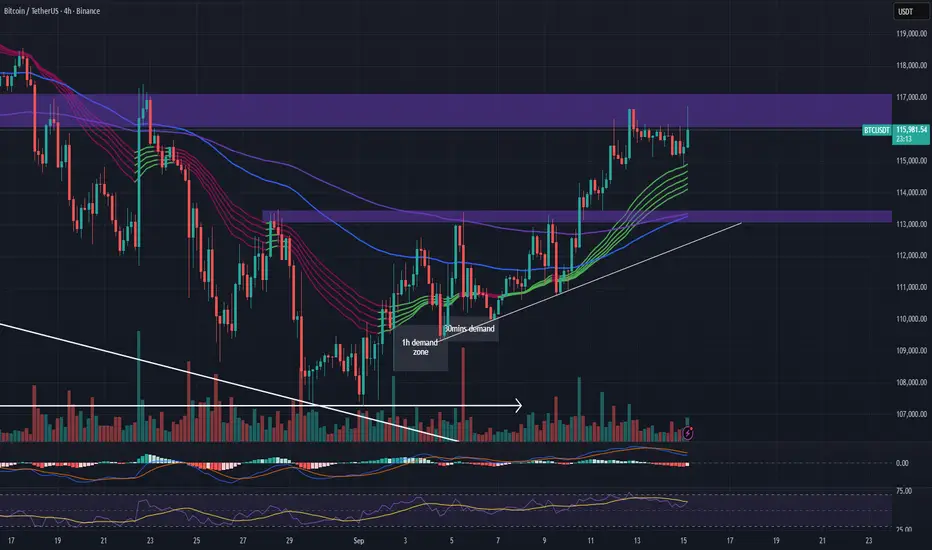 Price had reached the resistance at 116.5k where it got rejected exactly as predicted and is currently consolidating. MACD is starting to show some bearish weakness, RSI is bought and EMAs are bullish. Price needs to break and close above 117k in order to expect further bullish movements.