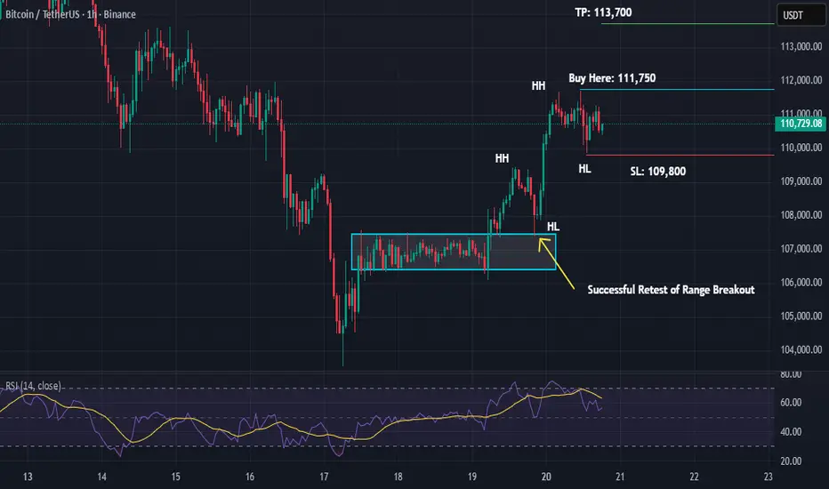 Bitcoin is in Bullish Trend on 1H Timeframe. on 4H Timeframe, Bitcoin can make a Higher-Low, which means price will retrace back to below 110,000 level. However, if it does not retrace back, and makes a Higher-High on 1H timeframe, we can take a 1:1 "Buy-Stop" trade here.