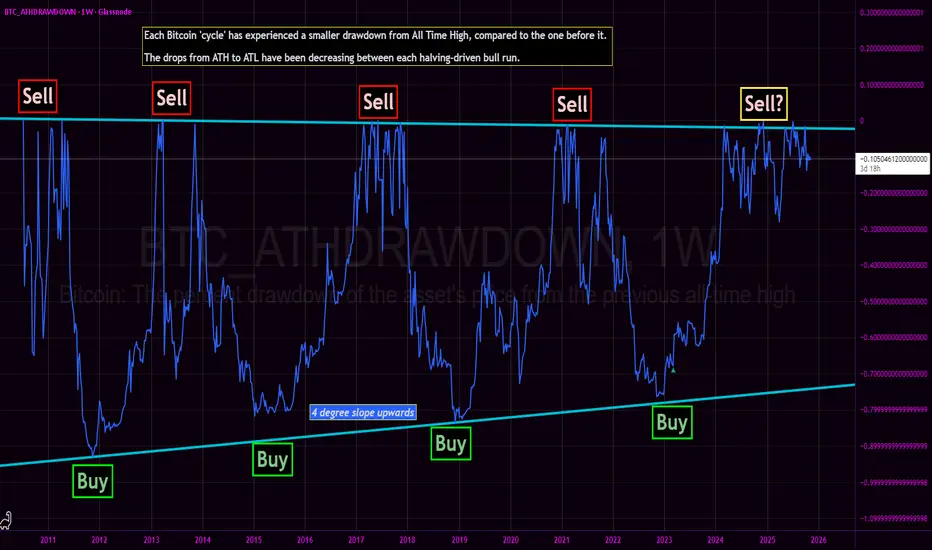 The core thesis of the BTC_ATHDRAWDOWN chart remains intact: each subsequent market cycle has exhibited a diminishing drawdown from its prior All-Time High, with generational cycle bottoms resting squarely on a discernible upward-sloping diagonal support (the 'Buy' line). The 2022-2023 bear market bottomed perfectly on this structural trendline, confirming the '4 degree slope upwards' trend.