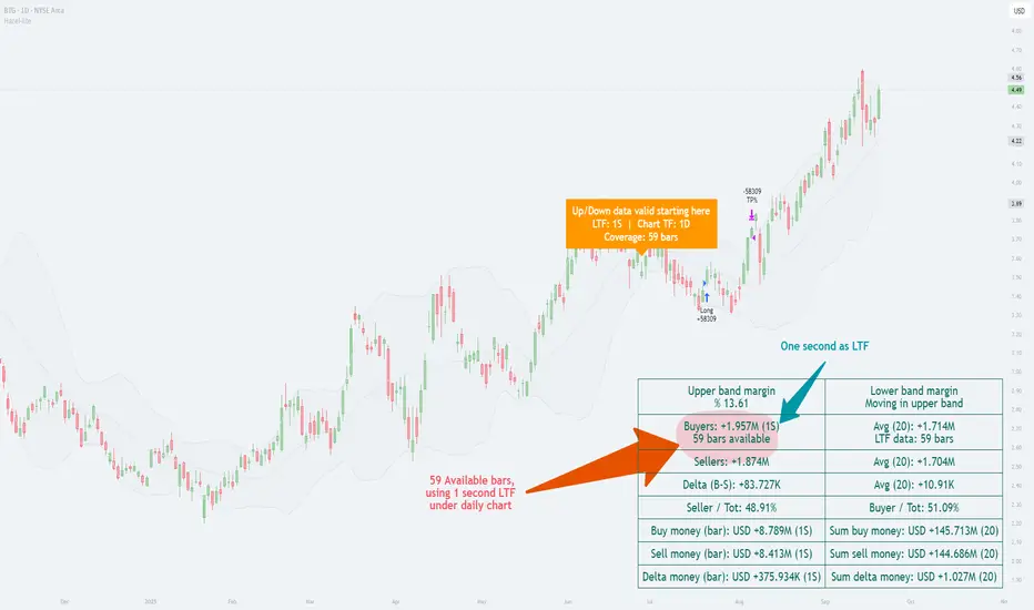 By presenting both the margin values (e.g., upper band margin 13.61%) and the absolute money flow, the chart connects higher-timeframe Bollinger Band context with the micro-timeframe order flow. The annotation “Up/Down data valid starting here” reinforces the importance of the helper: it alerts the user that valid LTF volume coverage begins from a specific point, preventing misinterpretation of missing data.