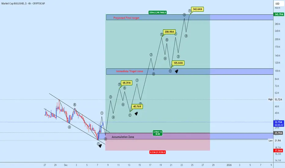 BULLISHD has completed a clean downside leg into the Accumulation Zone, where the structure has reacted with a strong impulsive breakout from the descending wedge structure. This reaction marks the beginning of a broader expansion phase, and price development now follows a multi-phase impulsive roadmap that is clearly outlined on the chart.