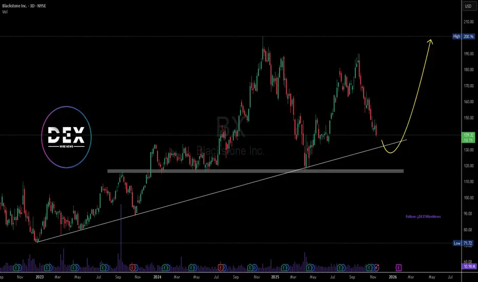 From a technical perspective, BX stock is approaching a key ascending trendline around the $135–$138 region. This level has historically acted as a strong support zone, signaling potential accumulation before the next major leg up. A sustained rebound from this level could pave the way for a bullish move toward the $200 mark in the coming months.