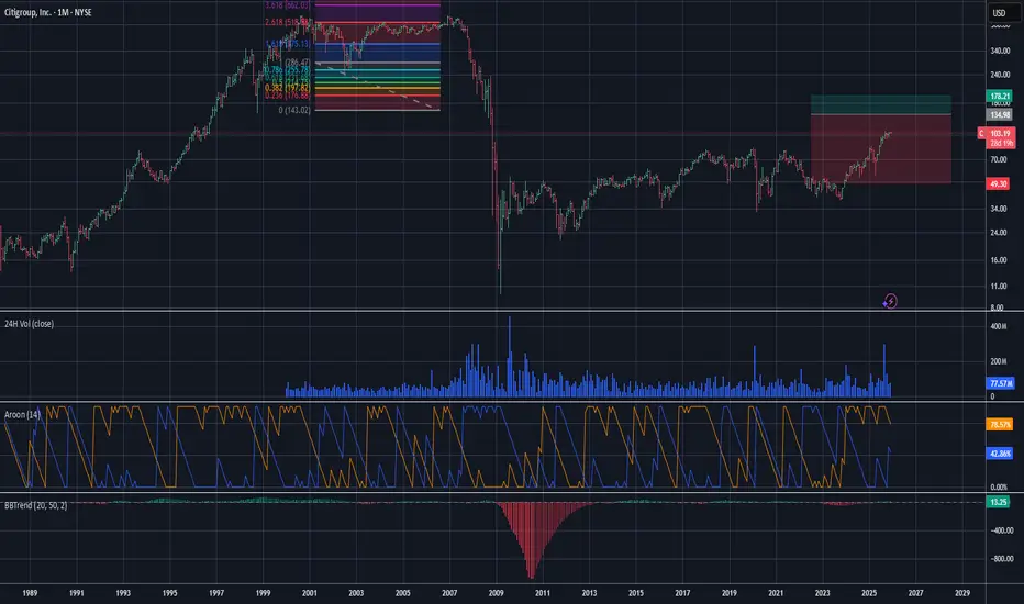 The support curve seems to be breaking again for Citigroup in similar pattern as it has had for nearly 14 years. If the curve doesn't allow for a continued uptrend, in which volume seems to be low, then it could end up retracing back down to $88. As always, none of this is investment or financial advice. Please do your own due diligence and research.