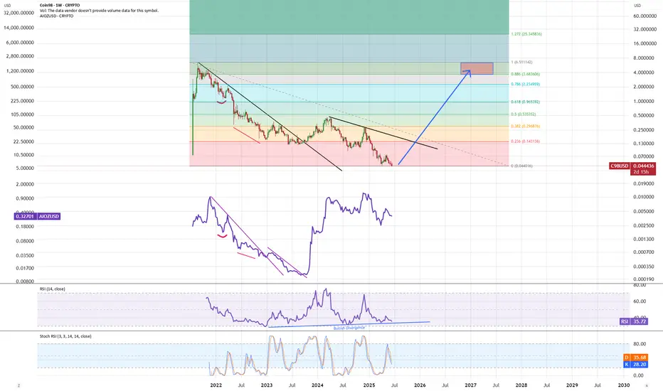 C98 is oversold, with bullish divergence and pattern similar to AIOZ before it reversed. I am expecting bounce up and push up to test August 2021 pivot at ATH range.