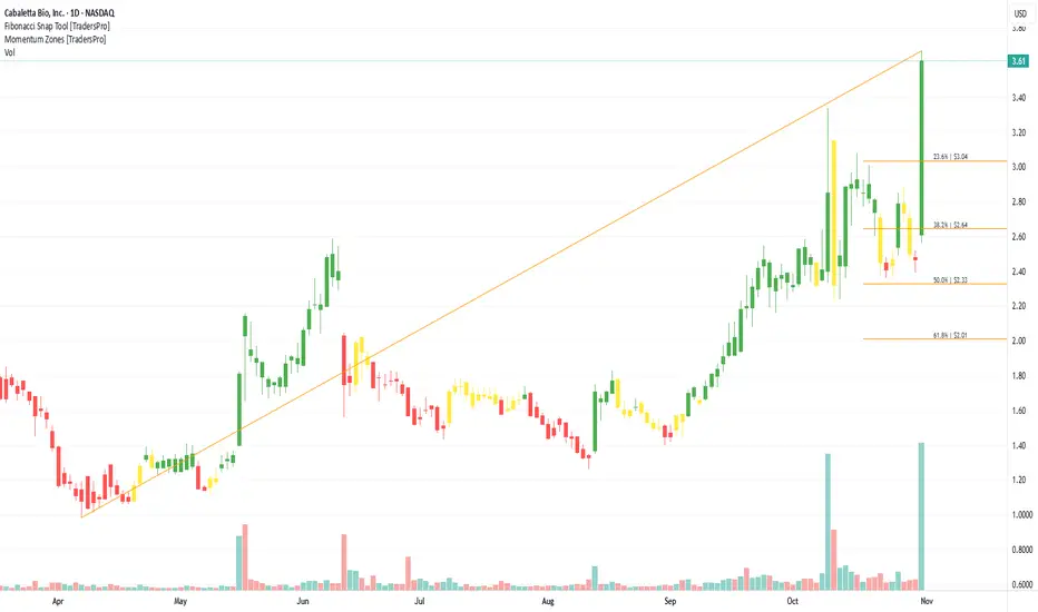 On the chart, a confirmation bar with rising volume highlights bullish sentiment. The price has entered the momentum zone after breaking above the .236 Fibonacci level. A trailing stop can be set just below this Fibonacci line using the Fibonacci snap tool, helping traders protect gains while leaving room for continued upside potential.