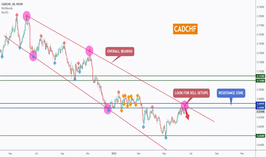 As CADCHF approaches the purple circle zone, I will be looking for bearish reversal setups (like a double top pattern, trendline break , and so on...)