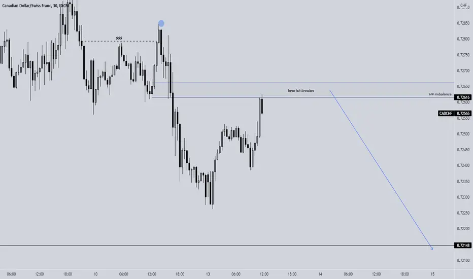I expect bearish price action on this pair as price is rejecting a bearish breaker on a m30 and filling the bearish imbalance h4, we are in a bearish market strucuture on a HTF.