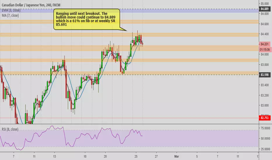 CADJPY has not been shy with its bullish direction. Currently, the price is ranging until it creates the next breakout move. 61.8% fib (now removed) is near 84.889 daily SR level. So waiting to see what price will do if it can reach there, or the weekly SR at 85.691.