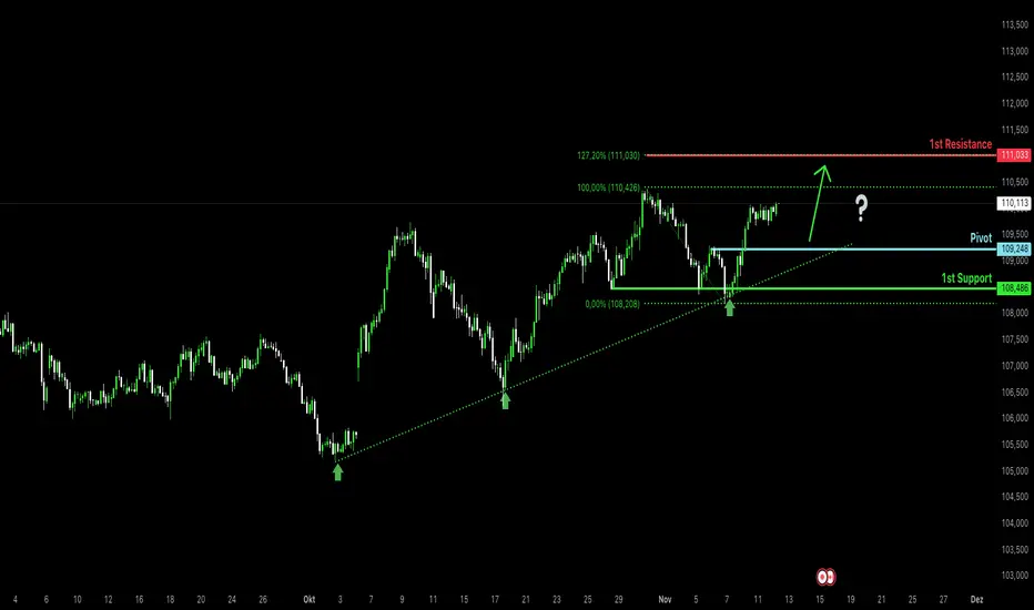 CAD/JPY is declining toward the pivot level, which has been identified as a pullback support. A rebound from this area could target the first resistance level, aligning with the 127.2% Fibonacci extension.