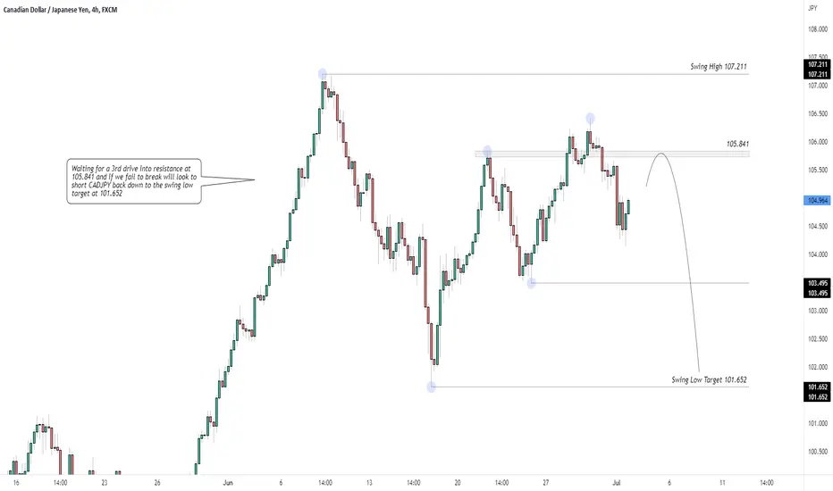 Waiting for a 3rd drive into resistance at 105.841 and if we fail to break will look to short CADJPY back down to the swing low target at 101.652.