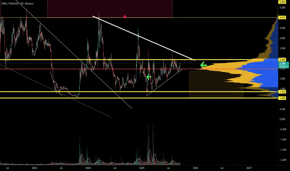 CAKE is forming its bottom with market participation, clearly defined by volume. The range that it is in defines a structure in which accumulation can begin. In fact, the price can still visit the bottom of the range and still maintain a bullish stance. As long as the price does not make a 1D LL, the bulls still have a good chance.