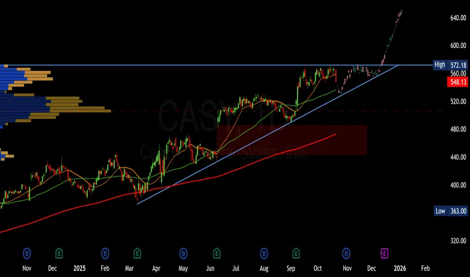 CASY Casey's is forming a potential ascending triangle, with higher lows (~$540–$550) and resistance at $580–$600. Bullish momentum (RSI ~65, positive MACD) suggests a breakout above $600 could target $620–$650 as Q2 earnings approach in December. A pullback to the $445–$480 gap offers a strong entry point for longs. Watch volume and earnings catalysts! Casey's General Stores, Inc. operates approximately 2,900 convenience stores in 19 states.