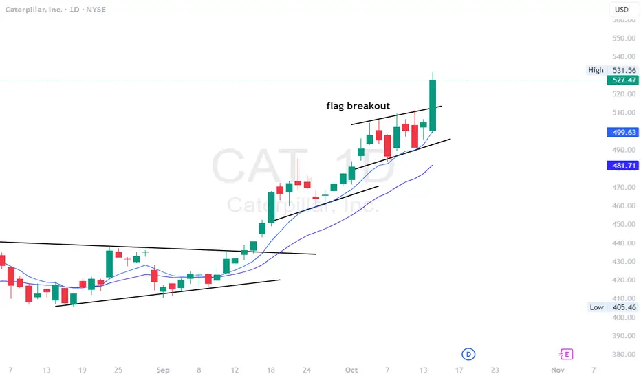CAT - Stock breaking out of the flag on the daily time frame and hitting new highs. Stock has next resistance at $530 . looking for calls above that for a move towards $550 and higher. Stock making a strong move today.