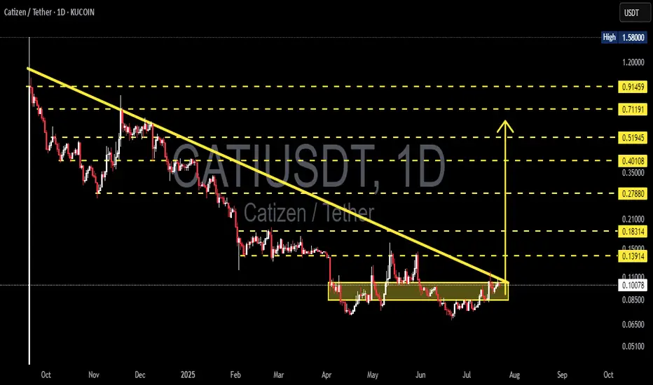 CATI/USDT is flashing a major trend reversal signal after months of accumulation and suppression under a dominant descending trendline. For the first time in almost 10 months, price action has successfully broken out of the downtrend, potentially setting the stage for a multi-layered bullish rally.