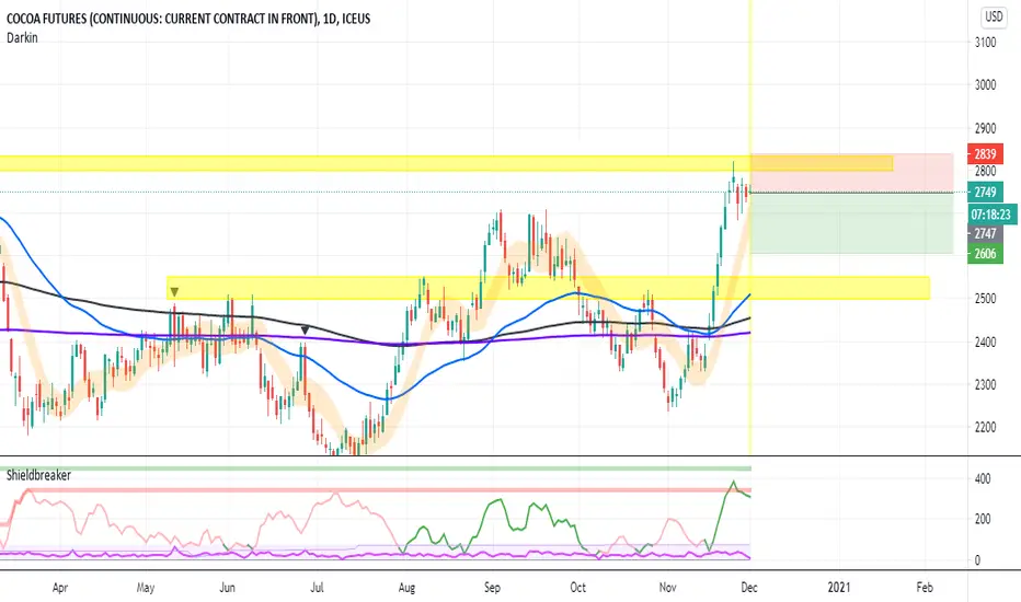 Cocoa usually begins falling by the end of they year. With the exception of 2018, there has been either a downside consolidation or flash crash in the recent yeats. Something has trigerred massive growth it November which is not common. Shieldbreaker indicator which measures distances almost made a new green high. I would expect that between February and May.