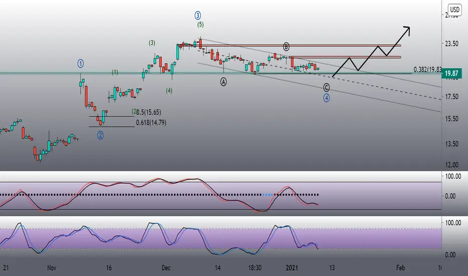 Surprisingly Carnival Cruise popped up on my scanner and has a good Elliott Wave count. The ABC correction is following parallel channel and demand zone lines up with the mid-line of the parallel channel. Wave 2 and Wave 4 are alternating and the 0.382 lines up with the demand zone. Looking for a play after earnings report this week.