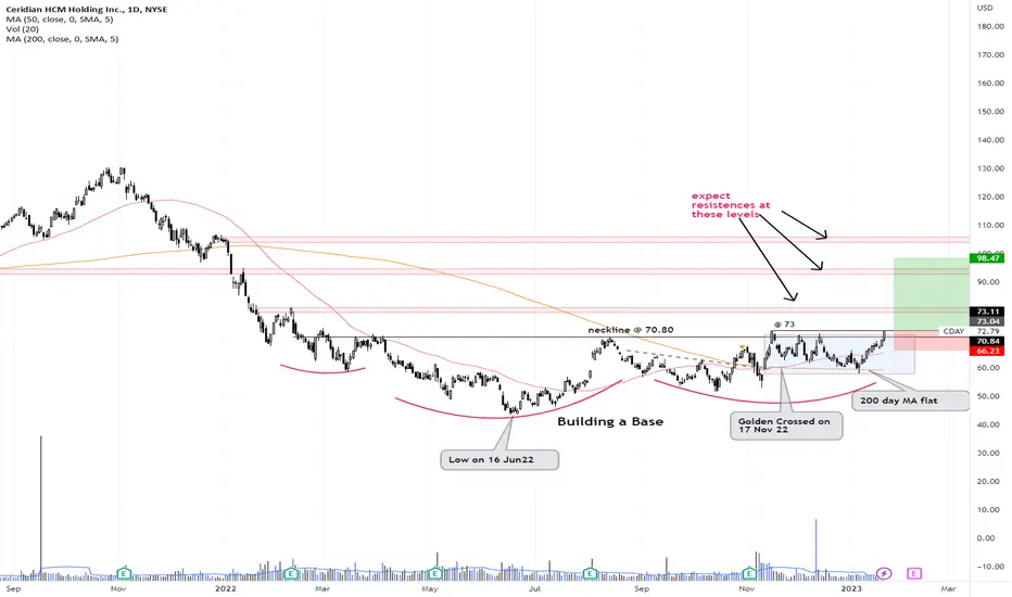 CDAY had been basing since hitting low on 16 June 2022 (7 months now). It formed a Golden Cross on 17Nov 2022 (2 months+ ago) but continued to trade flip flopped within a sideway range while it's 200 day moving average began to flatten out.