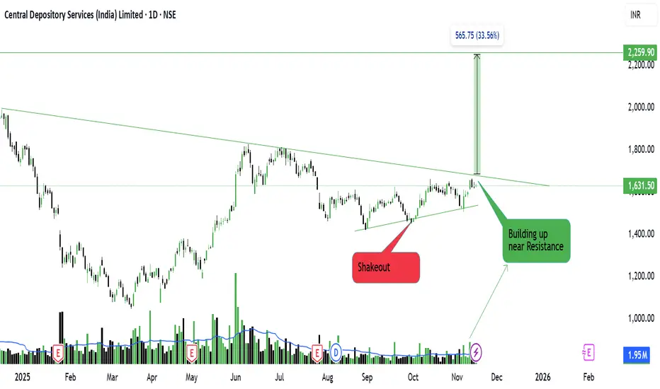 CDSL is showing a **beautiful post-shakeout structure** and currently building tight near its descending trendline resistance. After a deep shakeout in September, the stock quickly recovered, reclaiming lost ground and maintaining higher lows — a clear sign of demand returning.