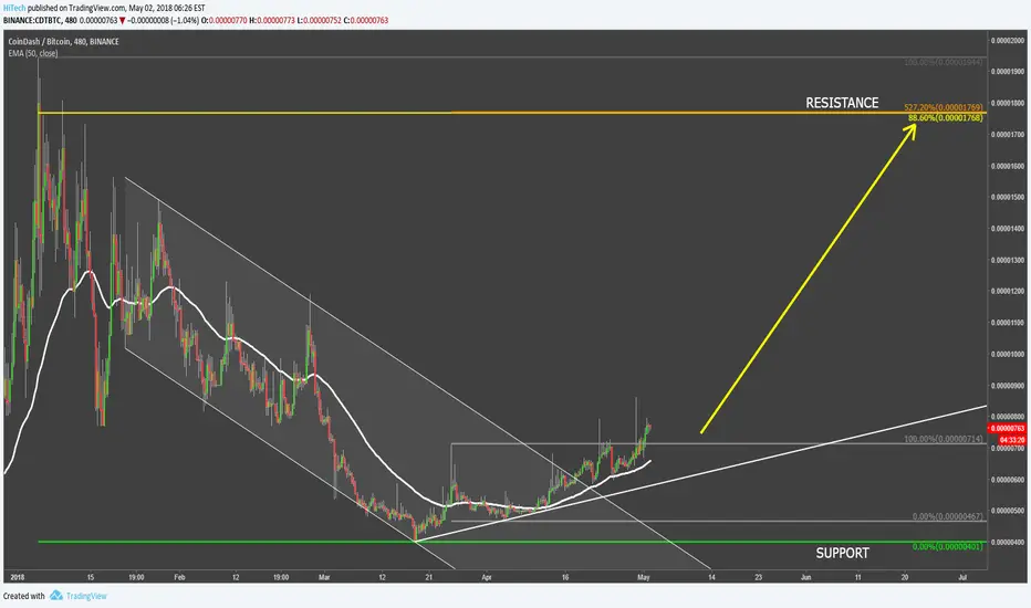 CoinDash has found th bottom at 400 satoshis and since then has established a clear uptrend while producing higher highs and higher lows. Price broke above the descending channel as well as 50 Moving Average. The 50 Moving Average now is acting as a support which has been rejected multiple times.