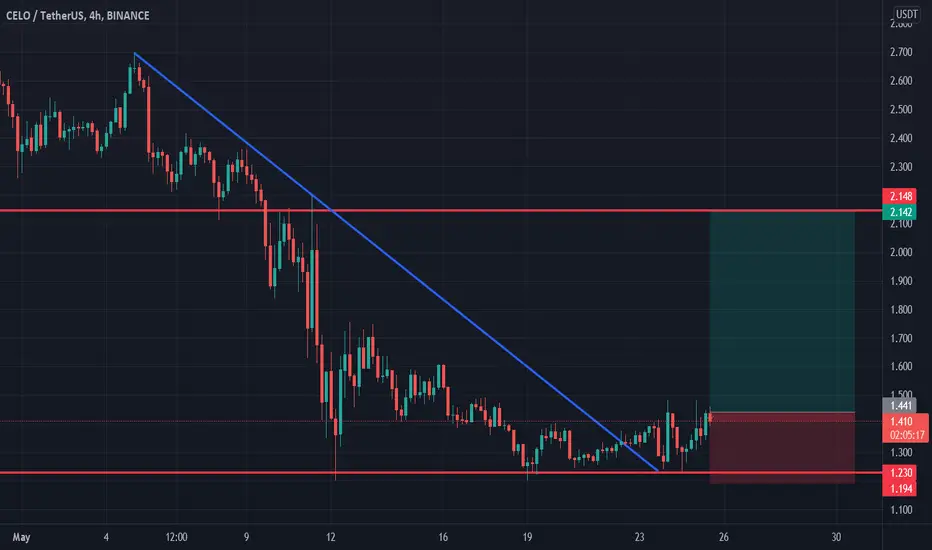 Celo bounced off the support level. Asset broke trough off the descending trendline. Bullish movement to resistance level at 2.14 is possible.