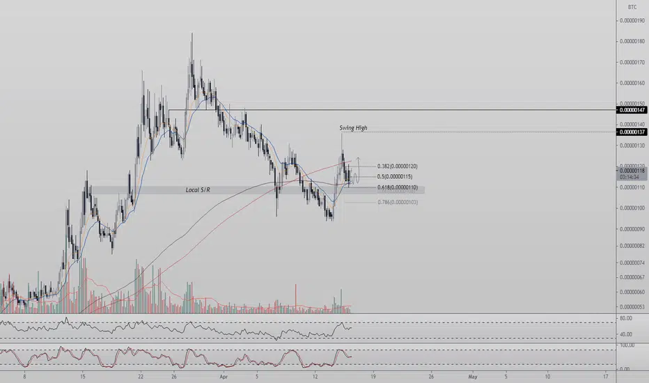 CELRBTC’s immediate price action is corrective, trading at a technical confluence location with the .618 Fibonacci and the Local S/R, allowing for a long bias.