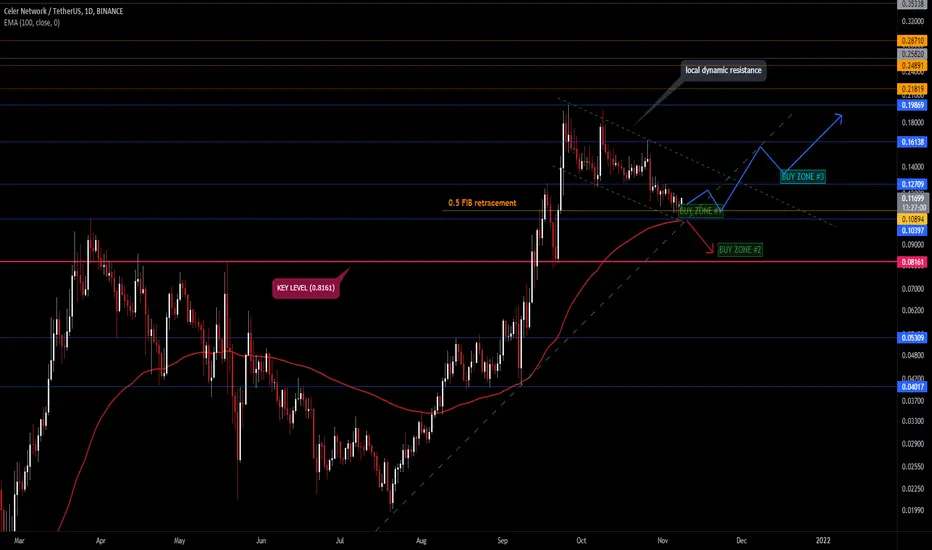 On 26th of September the price formed new all time high (0.19870). There was not enough buying pressure to hold 0.12709 level (previous ath) and so the price went lower and is now testing the level of highs from March 2021 as support. If this time buyers manage to push the price above the local dynamic resistance, we can expect more pressure to the upside, potentially to new all time highs. There's a strong confluence that indicates that the local bottom was reached: