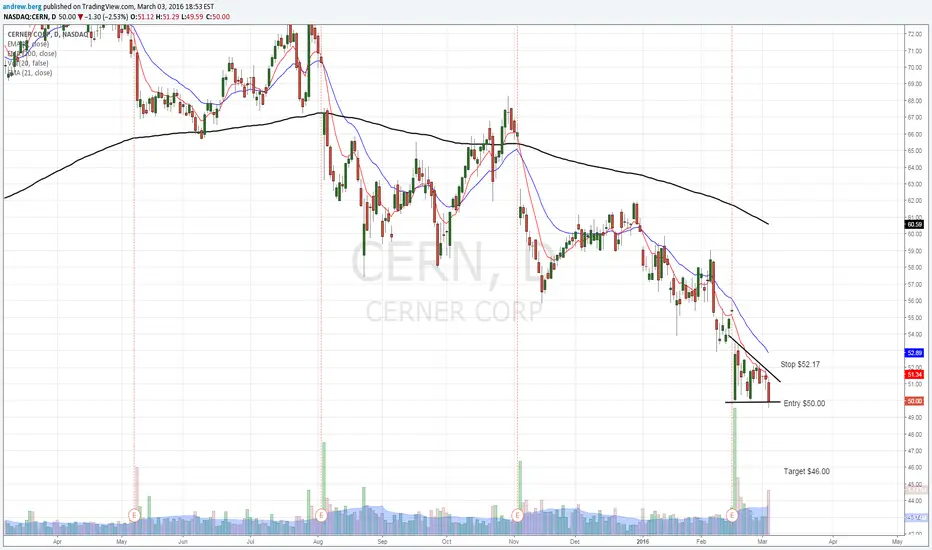 CERN continues to underperform. Overall chart is very weak, below all moving averages. And It feels like stock can accelarate to the downside when futures will find resistance. Today, it dropped down on big volume and closed right on $50 support, which acts like strong psychological level.