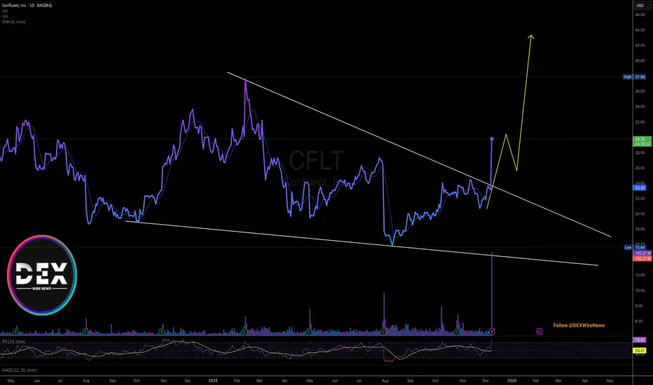 CFLT) experience a noteworthy uptick of 28% today amidst amidst breaking out of a bullish symmetrical triangle pattern.