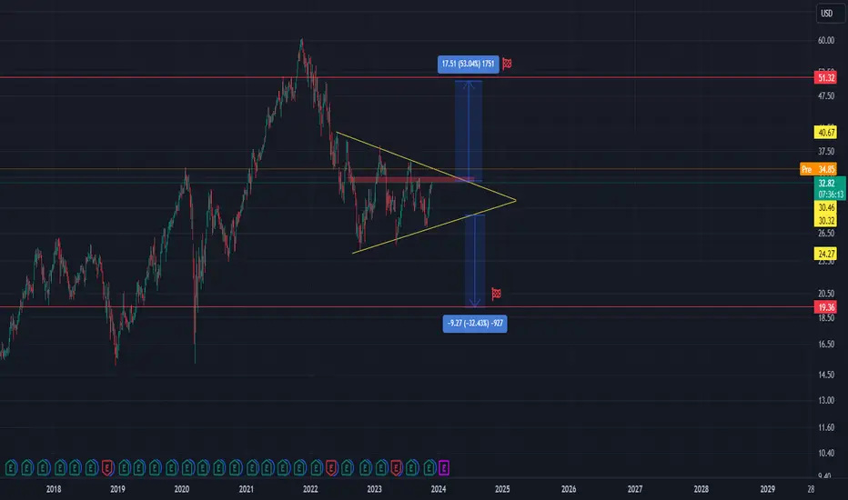 Carlyle Group stock was named to join the S&P MidCap 400, effective prior to the start of trading November 30. Therefore I expect breaking of this symmetrical triangle pattern soon. In case there is a bullish break out from here, price target is 53% rise in price. On the other side there is still big resistance in this area where we could see a rejection and possibly break to the downside. If this scenario happens, price target is 19.36$ which represents a 32% drop in price.