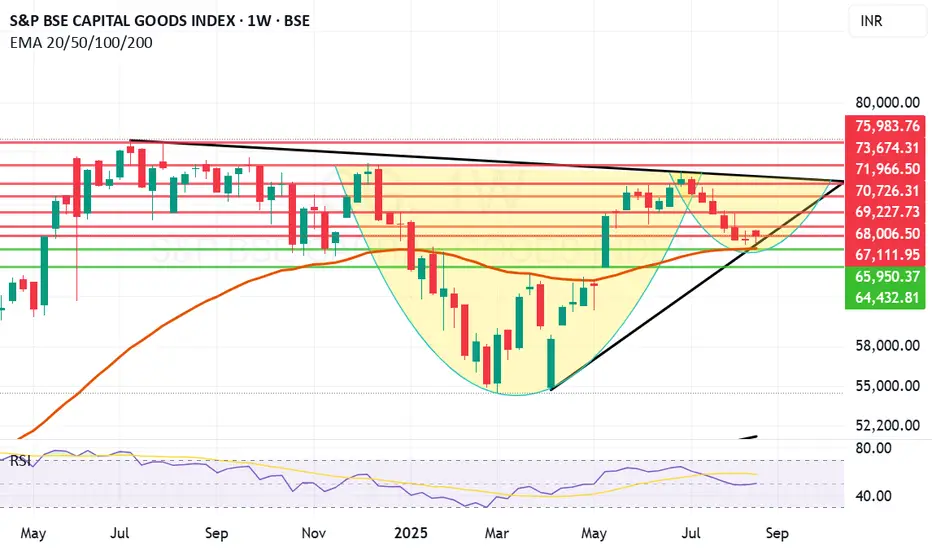 BSE Capital Goods index this week has taken support near the Mother line on weekly chart. Currently the weekly close at 67151. Mother line support is at 66005. If the Index can manage to close above 67893 or 68227 there is a strong chance of revival which can take the index towards 70727, 71K or even 72K+ levels as indicated in the chart. For this to happen the index needs to hold current level not close below 66K levels (Mother line) and move Northwards. In case 66K is broken the index can fall towards 65 or 64K levels. Right now the support is taken so the index looks strong. The pattern that we are seeing on charts is similar to cup and handle formation in progress. The formation has not succeeded so far but if this formation comes in full effect, the index will become very strong.