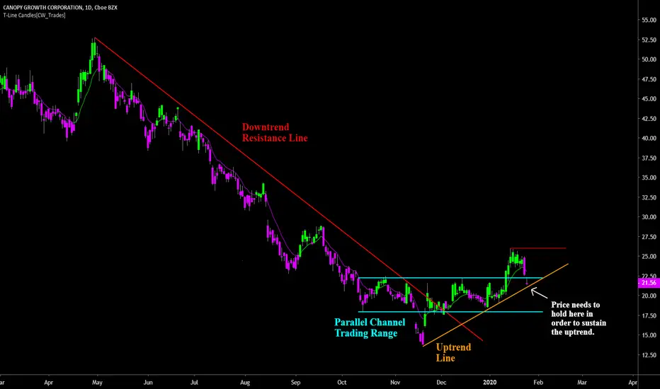 CGC is back to testing an uptrend support line after a recent channel breakout that had looked promising until pandemic fears shook the market today. Currently watching this uptrend line to see whether or not it is able continue propping up price. A bounce here would be bullish for CGC, a break below the uptrend line would put price back to neutral, or no trend with risk of turning bearish again.