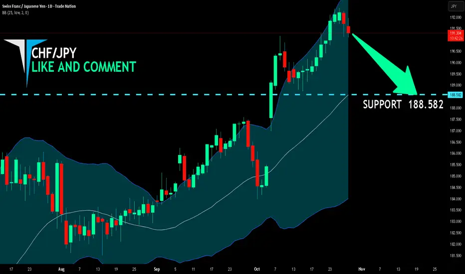 CHF-JPY uptrend evident from the last 1W green candle makes short trades more risky, but the current set-up targeting 188.582 area still presents a good opportunity for us to sell the pair because the resistance line is nearby and the BB upper band is close which indicates the overbought state of the CHF/JPY pair.