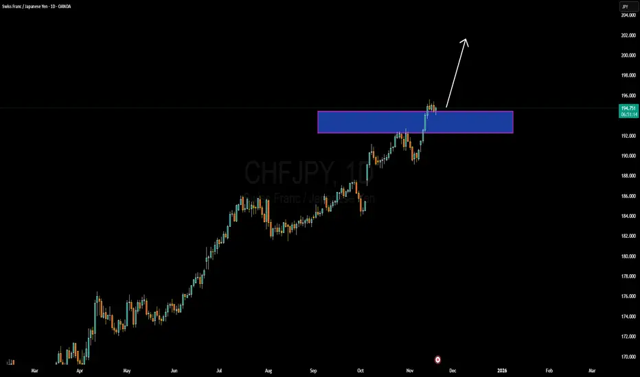 CHF/JPY is showing a strong bullish setup. The pair has broken above a key resistance zone around 192.00–194.00, which is now acting as support. Price has since consolidated above that level, suggesting that buyers are defending it and accumulation may be in progress. If the pair holds this base, there is potential for a further push toward 200.00+ in the medium term.