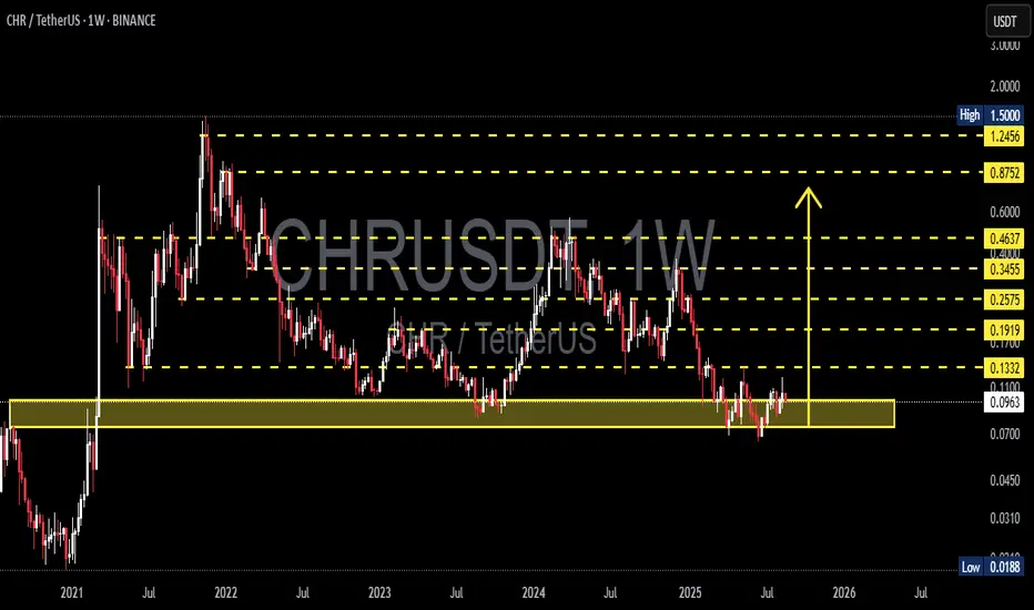 CHR/USDT is currently trading around $0.0971, right inside the historical demand zone $0.07–0.12, which has been a strong accumulation area since 2021.