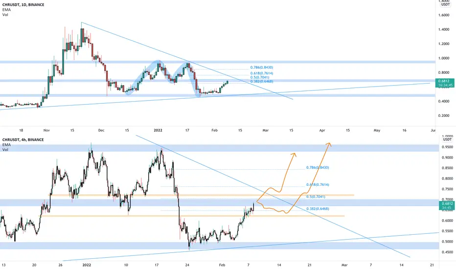 The price is testing the neckline of the M pattern on 0.67$ on the 0.5 Fibonacci level.