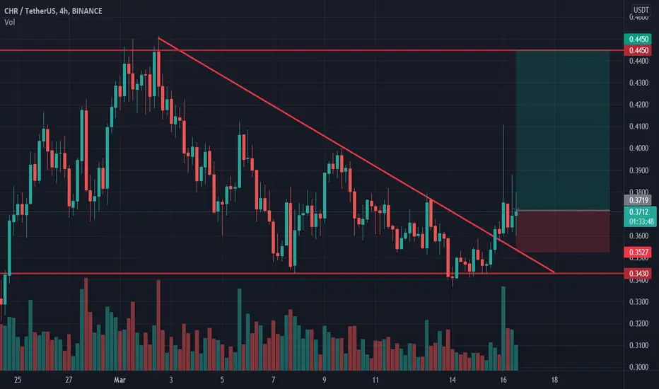 Chromia bounced off the support level. Asset broke trough off the descending trendline. Bullish movement to resistance level at 0.445is possible.