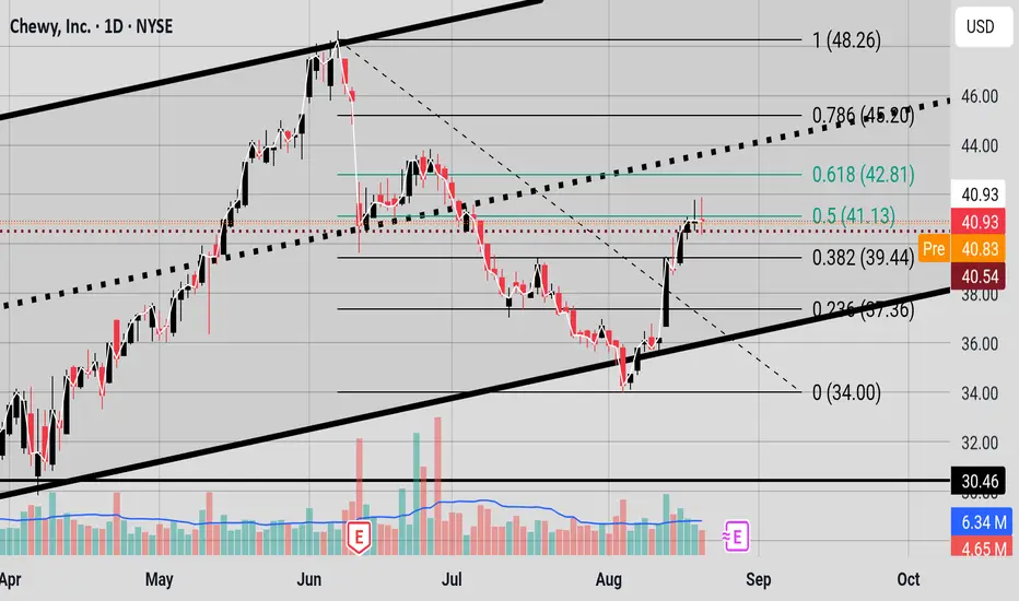 We have two Doji like candles near the Fibonacci golden zone. It seems the breakout from the 39.44$ price level could possibly be over. Bulls need a close above 42$ to continue the march, if not hopefully they can retest 39.44$ and make HH HL from there.