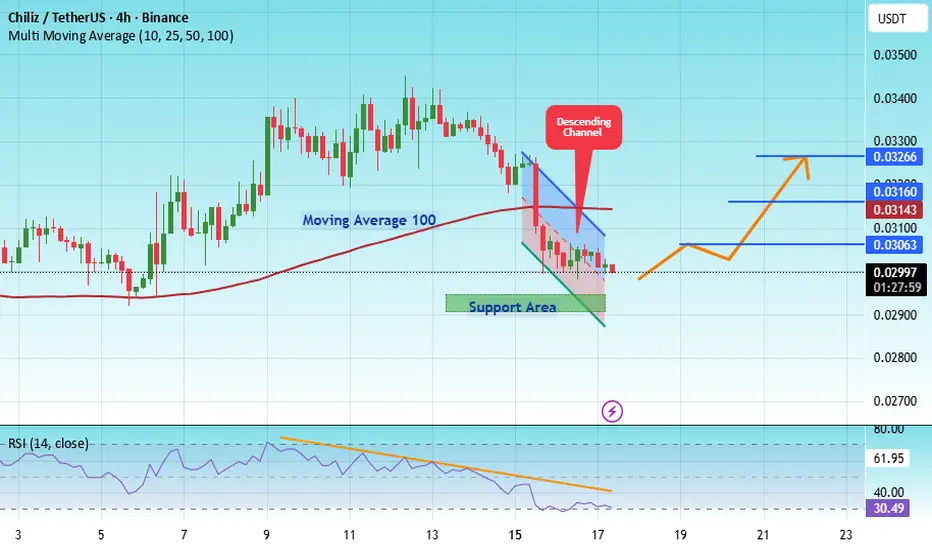 There is a key support zone in green at 0.02934. The price has bounced from this level multiple times and is expected to bounce again.