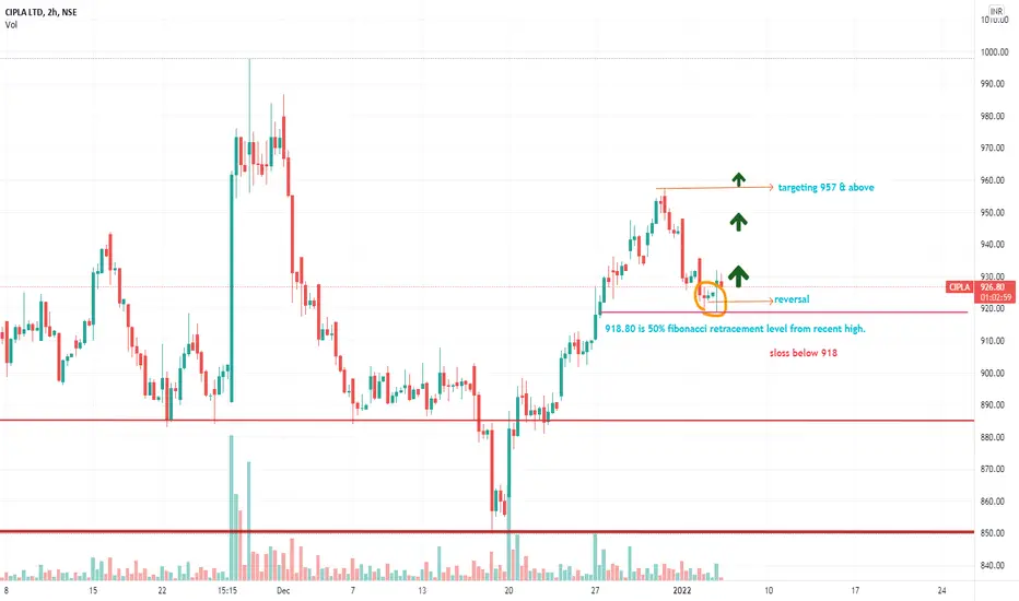 Cipla took support near 50% FIBONACCI RETRACEMENT level of 918.80 & reversed.