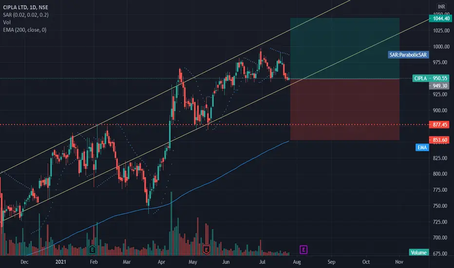 The stock has reached lower trend line and took support and is ready for a reversal rally. Trade is supported by brokerage calls and swing low, major supports & 200 EMA before SL levels. Target is placed with a risk reward ratio of 1:1.