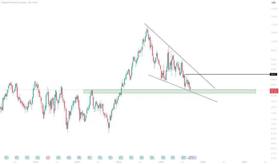 Price is at a major support area around $82 - $81. Looking for price to hold above $88 and break out of this wedge to flip bullish.