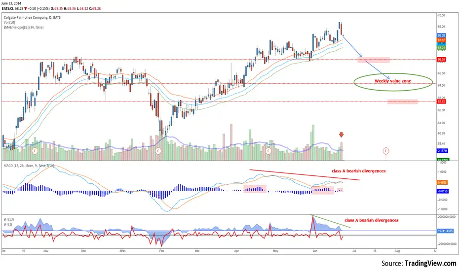 The daily chart has a closing marubozu candle, which might signal the start of the correction, note also the high volume. MACD lines and histogram show a class A bearish divergence, and so do both Force Indexes. First support comes at 66$. There is good support at 64$, where the weekly Wave stands approximately. That will be a level to watch closely if this correction is coming