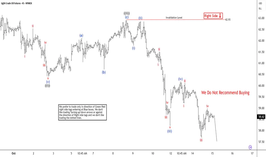 The short-term Elliott Wave analysis for oil indicates that a decline from the September 26, 2025, high is unfolding as a five-wave impulse. Starting from that peak, wave ((i)) concluded at $60.40, as depicted on the 45-minute chart. Subsequently, wave ((ii)) rallied in a zigzag Elliott Wave pattern. From the low of wave ((i)), wave (a) reached $62.12, followed by a pullback in wave (b) to $60.72. The upward move in wave (c) peaked at $62.93, completing wave ((ii)) at a higher degree.