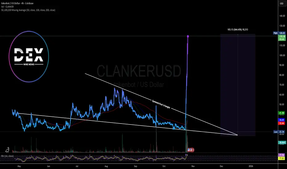 The price Tokenbot ($CLANKER) a set of audited smart contracts that create token markets which reward token creators. spike 65% today breaking out of a bullish symmetrical triangle pattern gearing to reclaim the recent All time high of $193 a year ago.