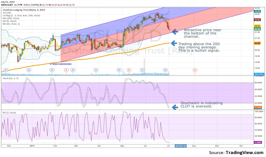 Attractive price near the bottom of the channel, and below 5 day moving average.