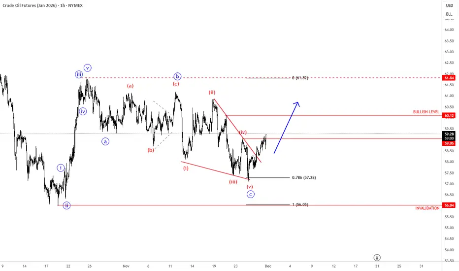 Crude oil made a very strong rebound back in mid-October with an impulsive move of more than 11%, while the current retracement from 62 is very slow, which still suggests a counter-trend movement despite the weakness now retesting the 78.6% support levels. We can still see three waves down, and ideally subwave c is coming into a potential support zone, so a rebound can still happen while the market trades above 55.96 invalidation.